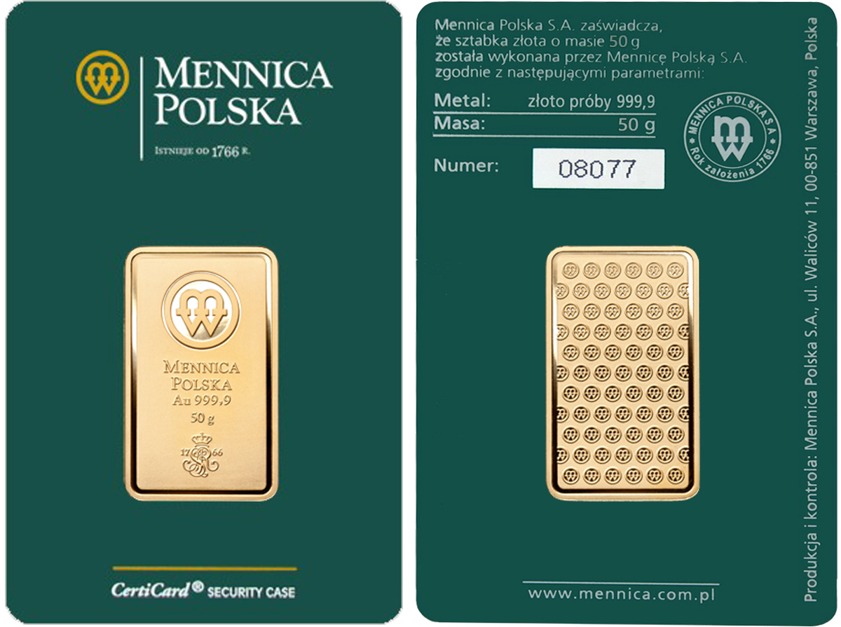 Sztabka Mennica Polska 50g NowaWybita z czystego złota próby 999,9. Produkt inwestycyjny o najwyższej jakości, oryginalny certipack, gwarantujący autentyczność i bezpieczeństwo przechowywania. | Próba 999.9 | Waga50 g | Cena skupuskup29 627 PLN | Cena sprzedażysprzedaż30 776 PLN |