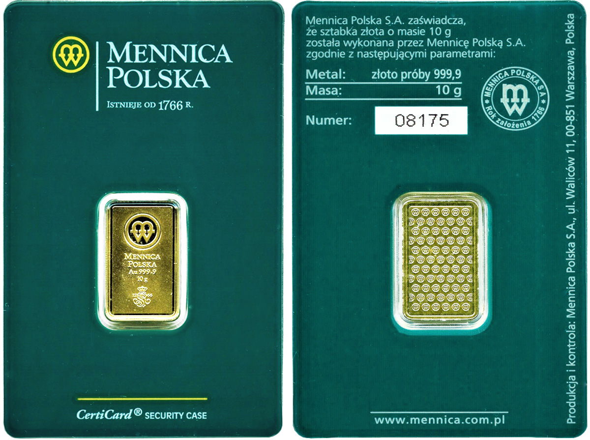Sztabka Mennica Polska 10g NowaWybita z czystego złota próby 999,9. Produkt inwestycyjny o najwyższej jakości, oryginalny certipack, gwarantujący autentyczność i bezpieczeństwo przechowywania. | Próba 999.9 | Waga10 g | Cena skupuskup5 925 PLN | Cena sprzedażysprzedaż6 252 PLN |