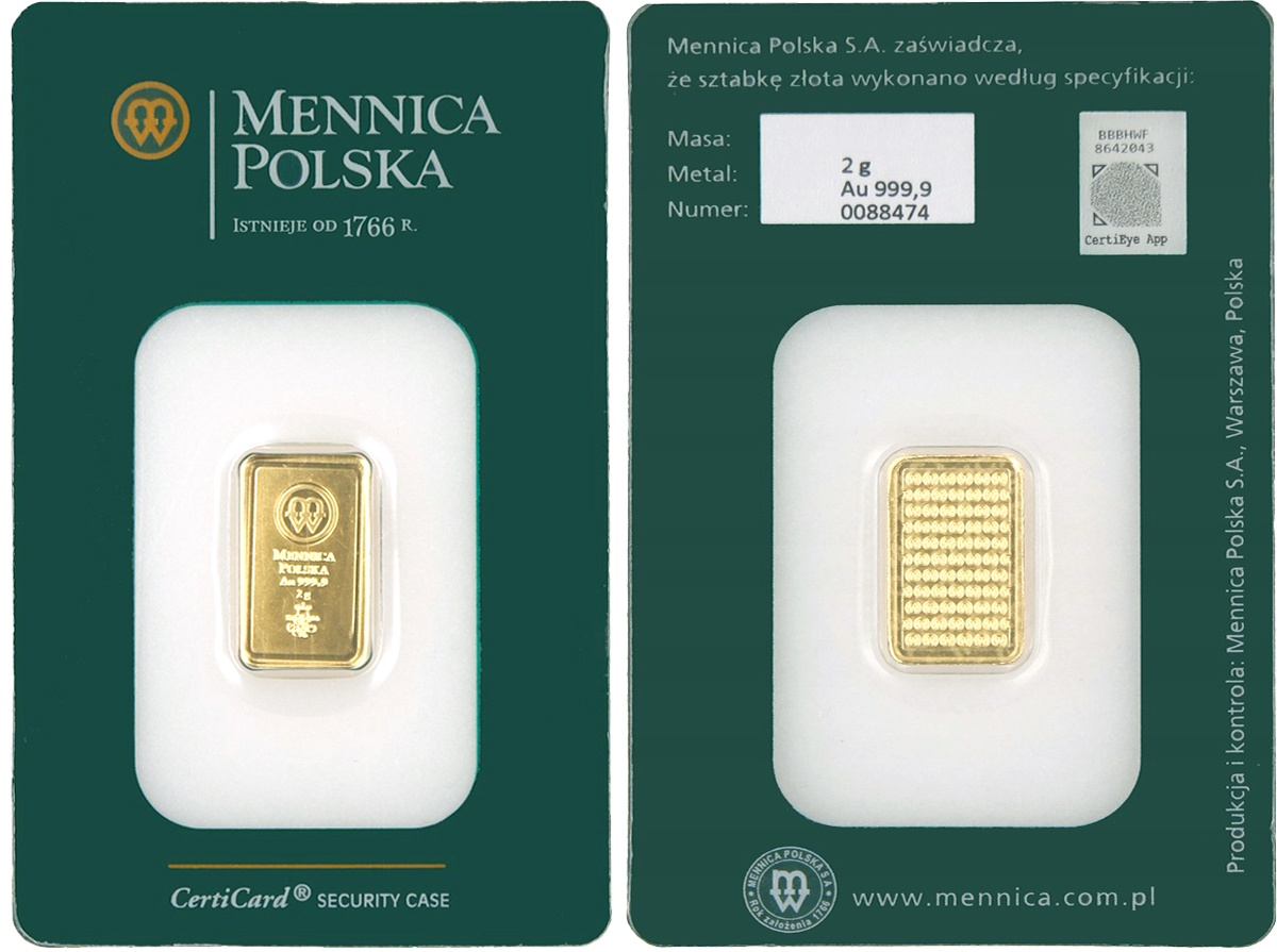 Nowa Sztabka Mennica Polska 2gWybita z czystego złota próby 999,9. Produkt inwestycyjny o najwyższej jakości, oryginalny certipack, gwarantujący autentyczność i bezpieczeństwo przechowywania. | Próba 999.9 | Waga2.0 g | Cena skupuskup1 185 PLN | Cena sprzedażysprzedaż1 294 PLN |