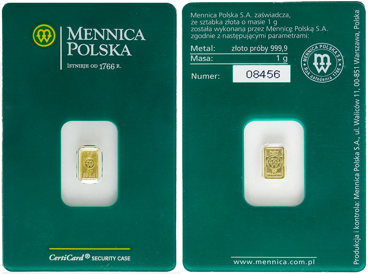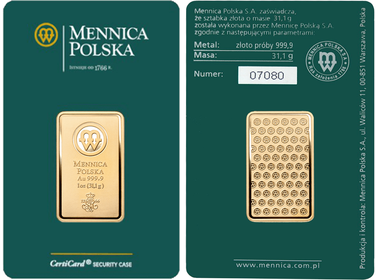 Sztabka Mennica Polska 31,1g NowaWybita z czystego złota próby 999,9. Produkt inwestycyjny o najwyższej jakości, oryginalny certipack, gwarantujący autentyczność i bezpieczeństwo przechowywania | Próba 999.9 | Waga31.1 g | Cena skupuskup18 428 PLN | Cena sprzedażysprzedaż0 PLN |