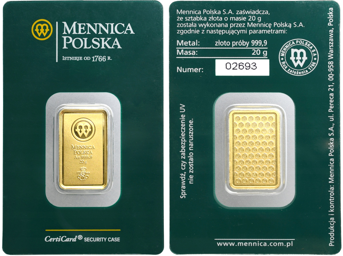 Sztabka Mennica Polska 20g NowaWybita z czystego złota próby 999,9. Produkt inwestycyjny o najwyższej jakości, oryginalny certipack, gwarantujący autentyczność i bezpieczeństwo przechowywania | Próba 999.9 | Waga20 g | Cena skupuskup11 851 PLN | Cena sprzedażysprzedaż0 PLN |