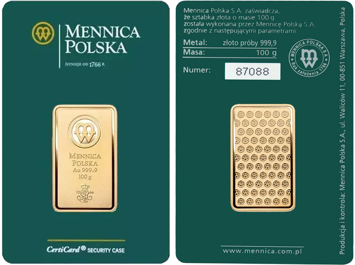 Sztabka Mennica Polska 100g NowaWybita z czystego złota próby 999,9. Produkt inwestycyjny o najwyższej jakości, oryginalny certipack, gwarantujący autentyczność i bezpieczeństwo przechowywania | Próba 999.9 | Waga100 g | Cena skupuskup54 976 PLN | Cena sprzedażysprzedaż0 PLN |