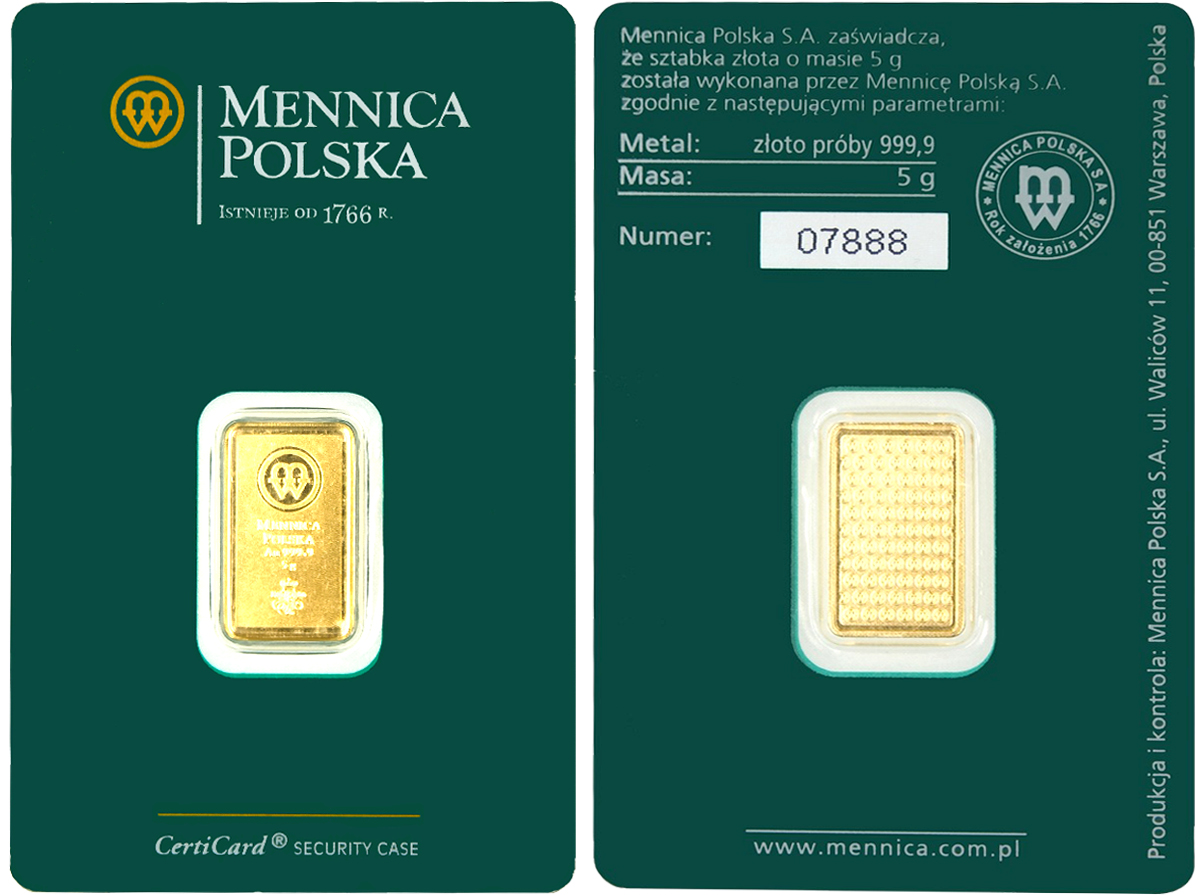 Sztabka Mennica Polska 5g NowaWybita z czystego złota próby 999,9. Produkt inwestycyjny o najwyższej jakości, oryginalny certipack, gwarantujący autentyczność i bezpieczeństwo przechowywania. | Próba 999.9 | Waga5 g | Cena skupuskup2 749 PLN | Cena sprzedażysprzedaż0 PLN |
